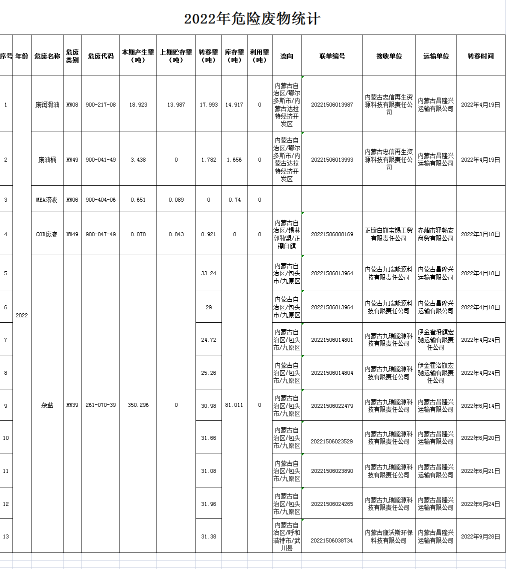 內蒙古匯能煤化工有限公司2022年危險廢物信息公示