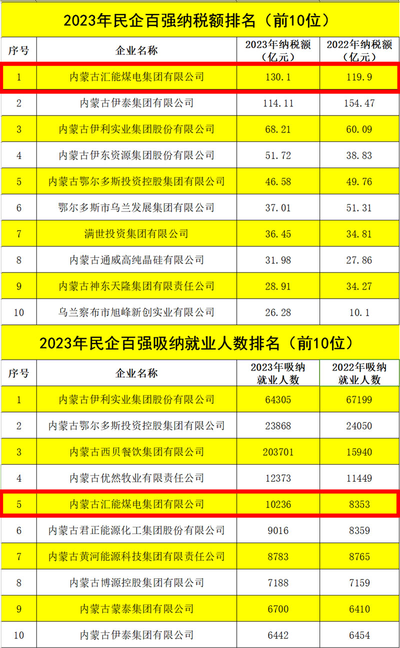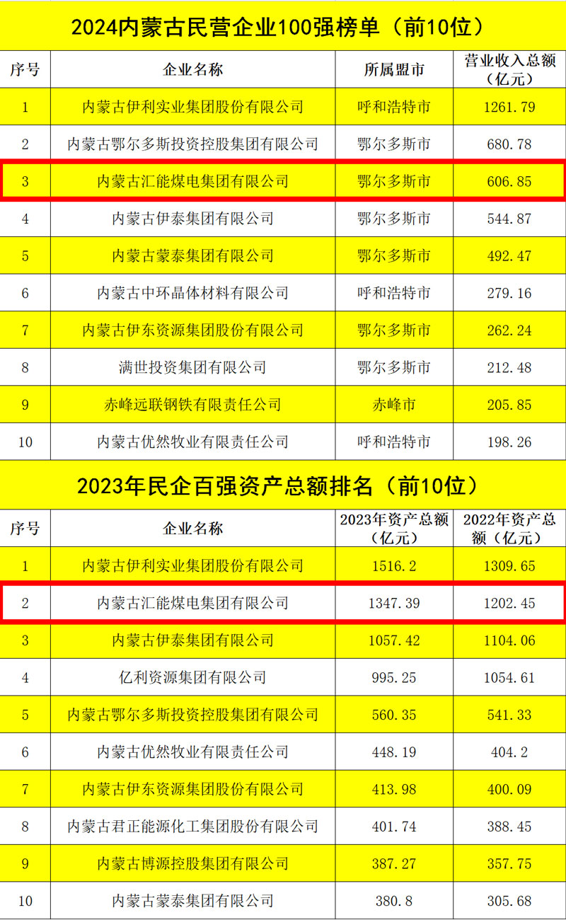 6月25日,2024內蒙古民營企業100強發布會暨內蒙古自治區促進“兩個健康”現場會在內蒙古鄂爾多斯市舉行。會上公布了2024內蒙古民營企業100強系列榜單,匯能集團以606.85億元營收總額榮列百強榜單第三位,較上年增長110.41億元,上升一位;資產總額1347.39億元,較去年增長144.94億元,仍位列民企百強第二位;納稅額130.1億元,位列民企百強第一位,較上年增長10.2億元,上升一位;吸納就業人數10236人,位列民企百強第五位,較上年增加1883人,上升兩位。