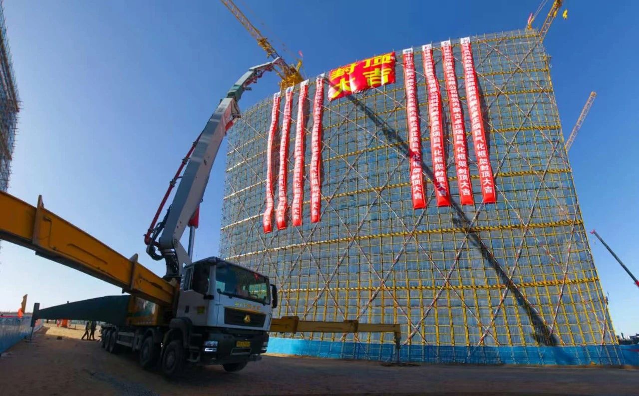 冬日寒風凜冽,但擋不住建設者奮戰的熱情。氣化裝置建設現場條幅高懸,炮聲不斷,充滿了喜慶的氛圍。11 月 28 日,氣化框架迎來重要里程碑——41.46m 喜迎混凝土封頂。泵車伸出長長的臂膀,把混凝土罐車拉來的混凝土送入氣化框架 41.46m 頂部。此次澆筑工程規模大,共需澆筑 685 立方米混凝土,現場投入2 臺 72 米泵車協同作業,經過連續 11 小時的奮戰,最終成功完成澆筑任務。